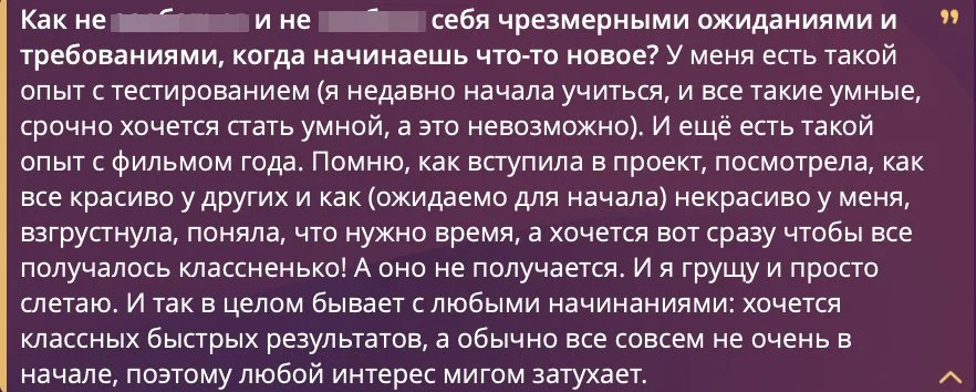 Когда я хочу чувствовать себя так будто у меня есть двух-трехлетний опыт работы в чём-то, то я: не выношу себя тем, кто еще что-то не умеет и обесцениваю путь людей, которые уже умеют и у них получается классно.